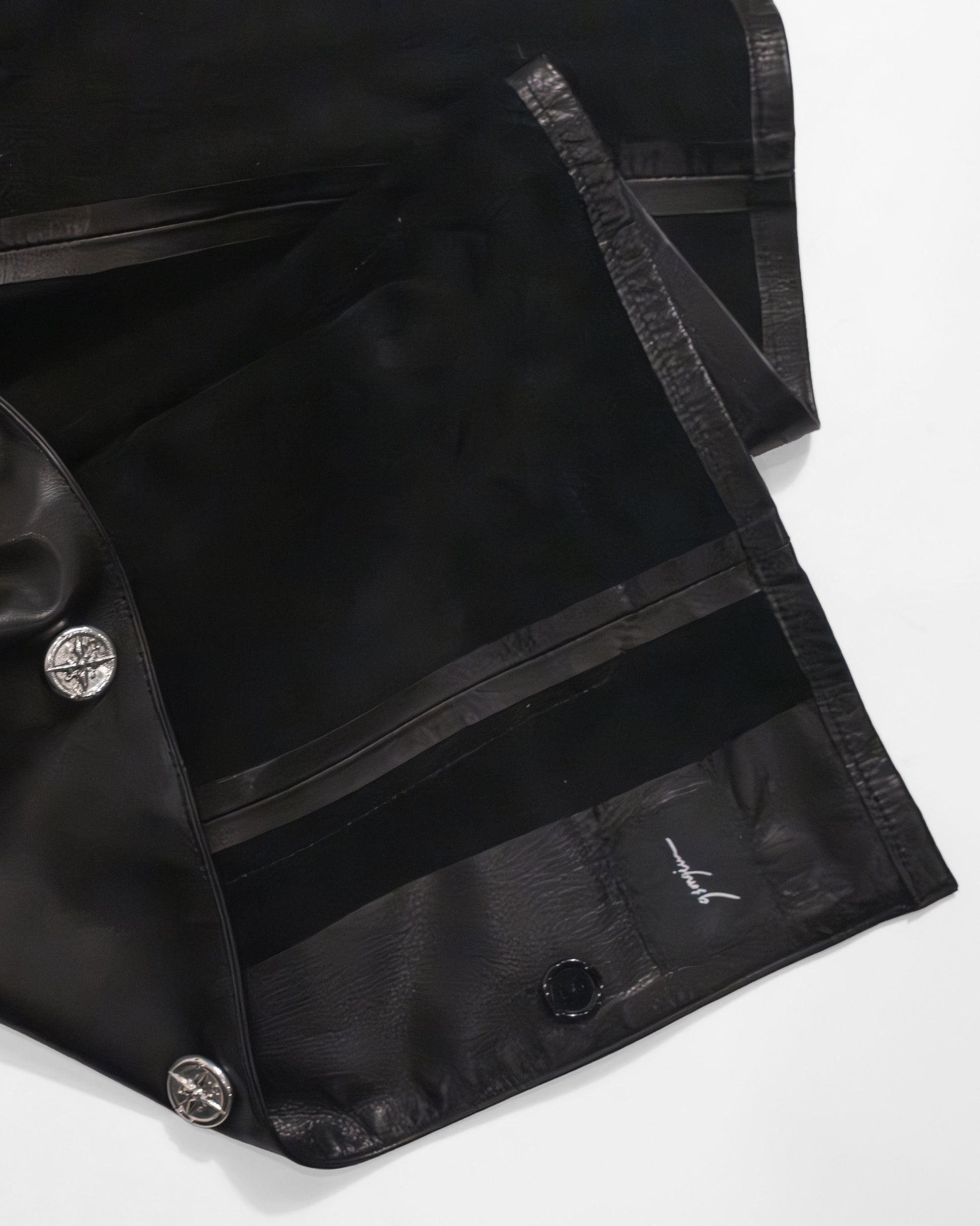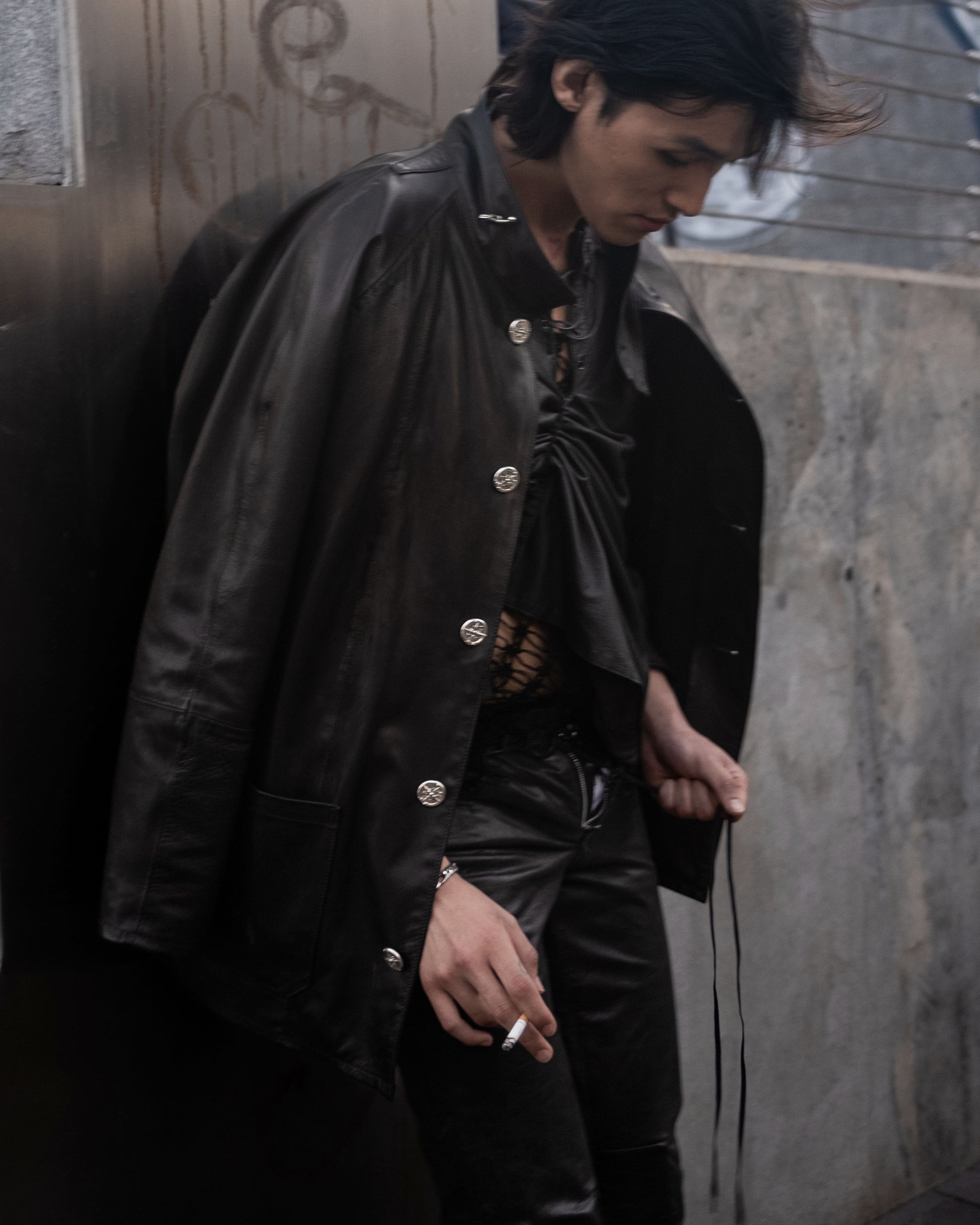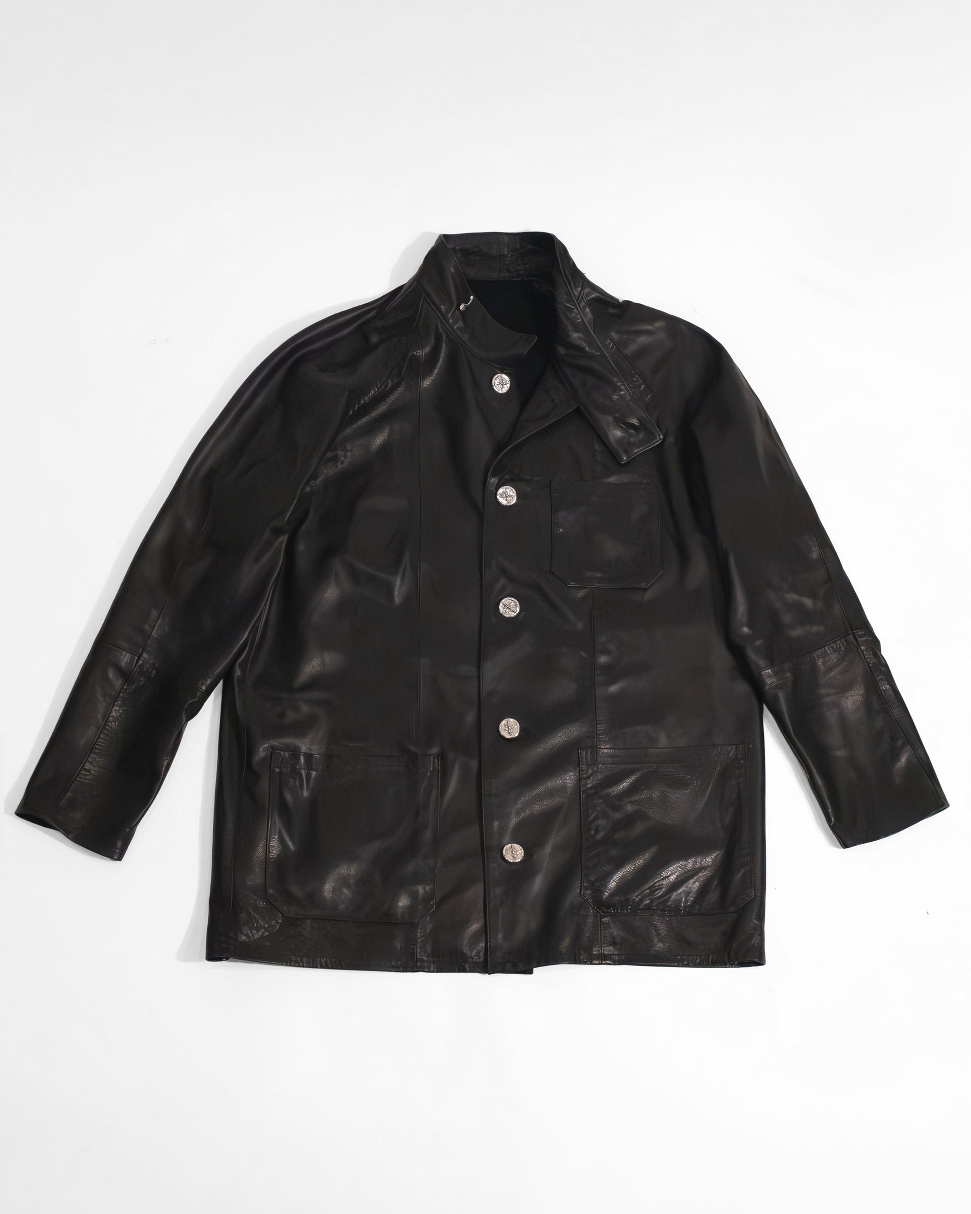 The gsongim Work Jacket is made from soft, rounded drape 1.1 oz calfskin. It features my 3D-designed .925 sterling silver buttons reinforced by backing buttons and keyhole buttonholes. The silhouette is an extended mandarin collar with raglan sleeves for a wider range of sizing accompanied by single chest and side patch pockets. Unlined, this jacket serves as a shirt or light outer layer and is meant to have an oversized fit.