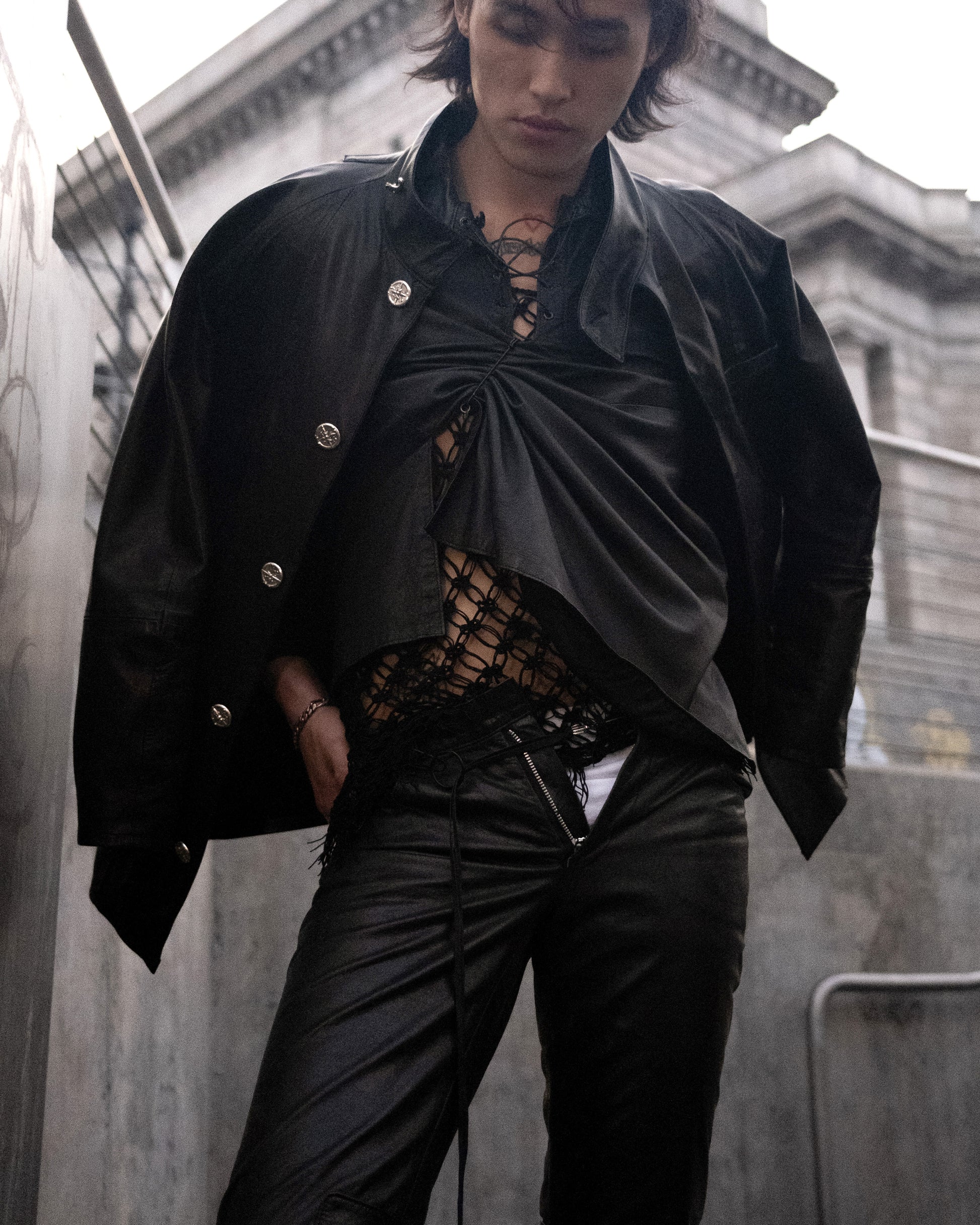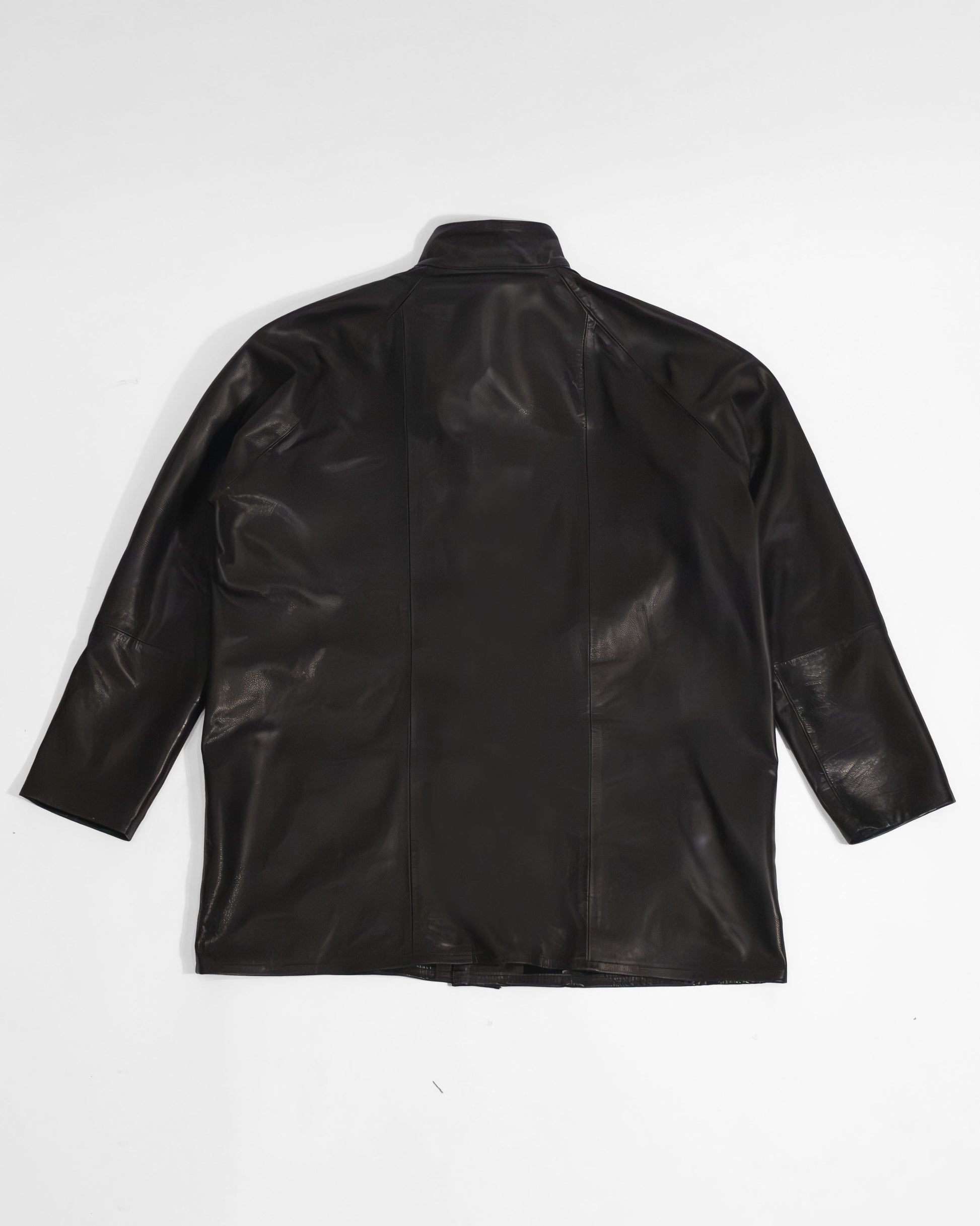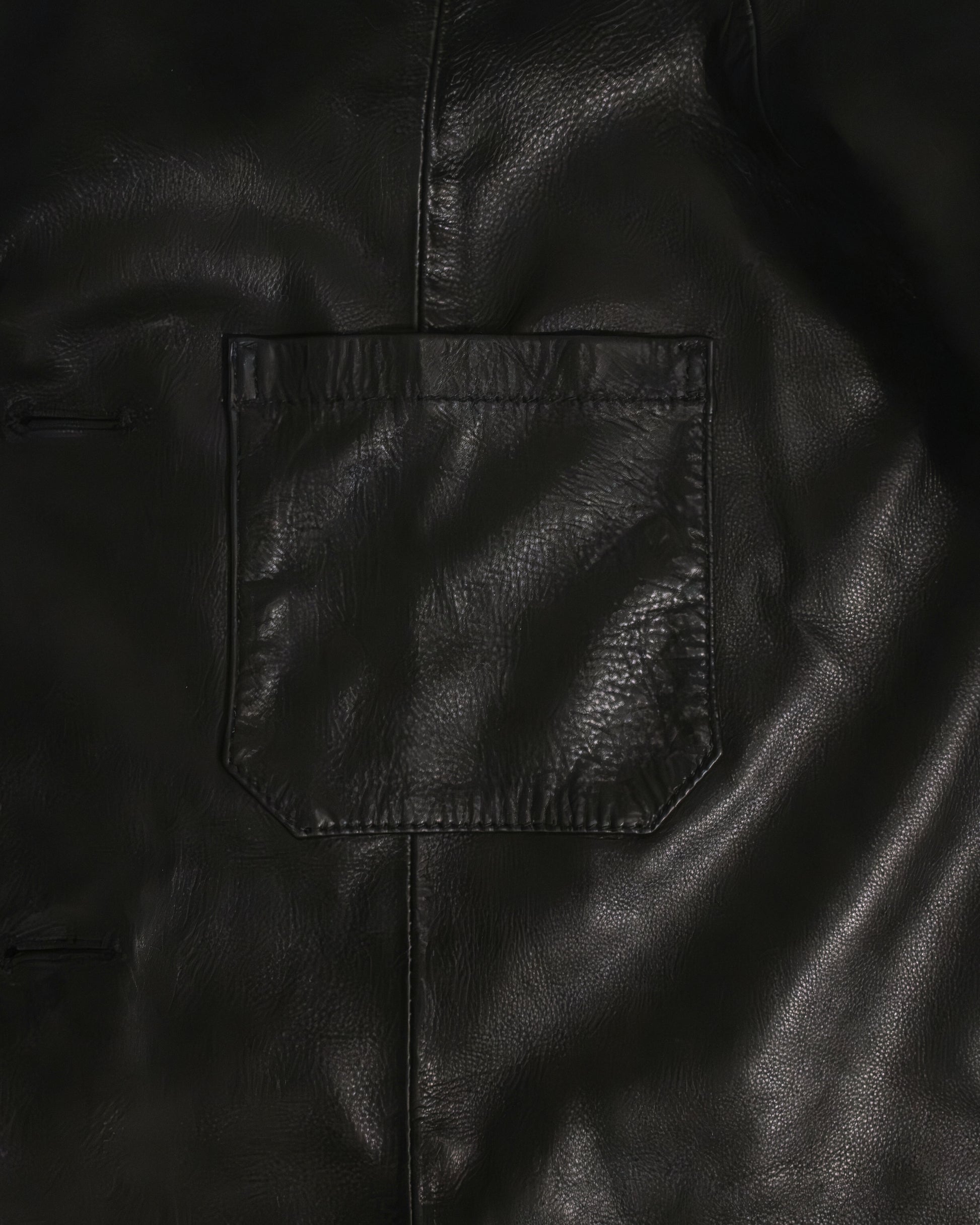 The gsongim Work Jacket is made from soft, rounded drape 1.1 oz calfskin. It features my 3D-designed .925 sterling silver buttons reinforced by backing buttons and keyhole buttonholes. The silhouette is an extended mandarin collar with raglan sleeves for a wider range of sizing accompanied by single chest and side patch pockets. Unlined, this jacket serves as a shirt or light outer layer and is meant to have an oversized fit.