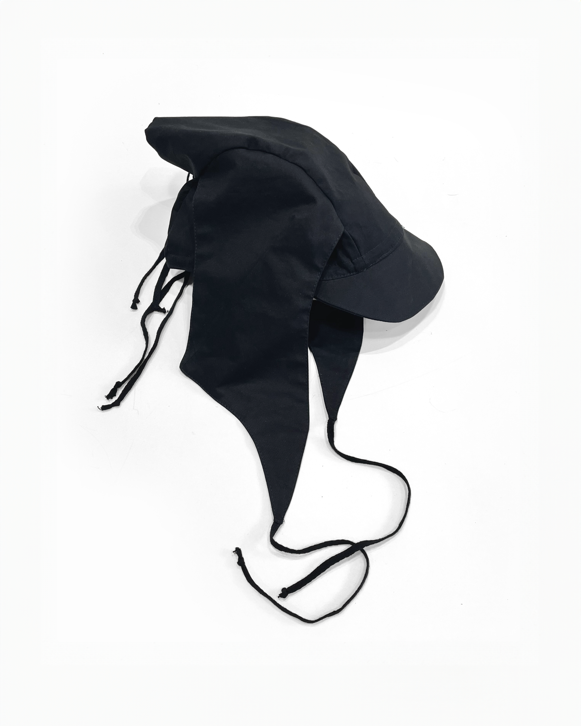 Im/p cap is a cotton-blend adjustable cap with stylized ear flaps to tie multiple ways with a bandana flared crown for breathability. Double gunmetal adjustable toggles are reinforced with 100% cotton twill tape lined on the inside.